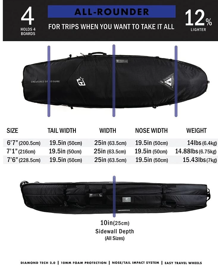 The All-Rounder 3-4 Boardcover is designed for surf/life travel travel. It has a more traditional coffin template, catering to surfers travelling with a range of different board shapes; from your regular shortboard to your favourite fish or soft board. The added internal capacity is perfect for packing everything needed for family surf trips or trips where you want to take it all.