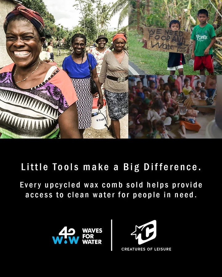 Little tools can make a BIG difference! Each up-cycled wax comb and leash string sold provides monetary proceeds to the WAVES FOR WATER foundation. Giving water to those who need it…