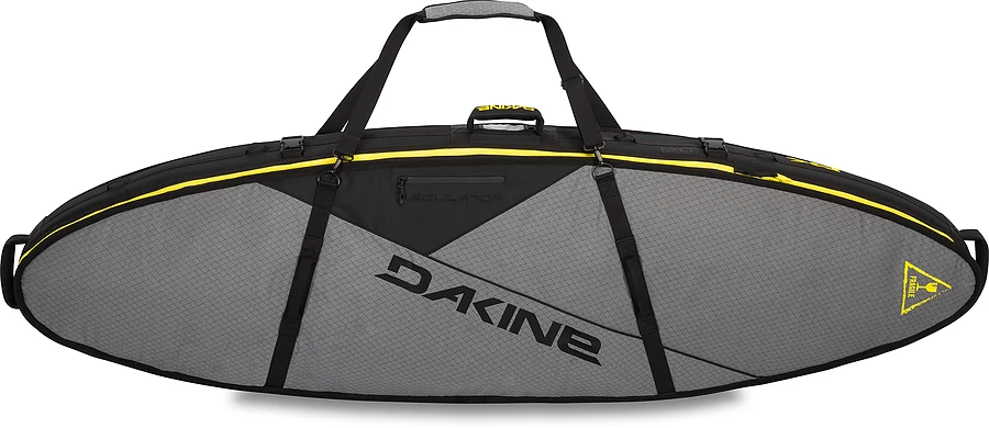 Answer the call of travel with our Regulator Surfboard Bag. Designed to hold three boards, this is your go-to protective travel bag. 3/8-inch foam padding cradles your boards, while 3/4-inch foam sidewalls guard against the inevitable beatings of extended travel. Bomber ripstop exterior offers adventure travel durability and light weight. A heat-reflective bottom guards from the hot sun on the roof rack, and heavy-duty zippers go the distance. Internal fin and wax pockets keep you organized on the go.