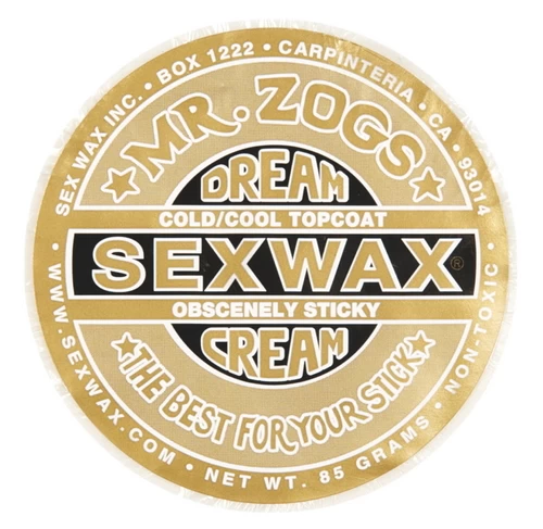 Mr. Zogs Sex Wax Dream Cream is the latest in topcoat technology. Zogs suggests that this be used sparingly, and by experienced surfers only. This Gold label Dream Cream is good for water temps between 68°F or 20°C below, and is recommended to be used over the appropriate Quick Humps Base. Store in a wax container or leak proof bag to avoid unwanted mess.