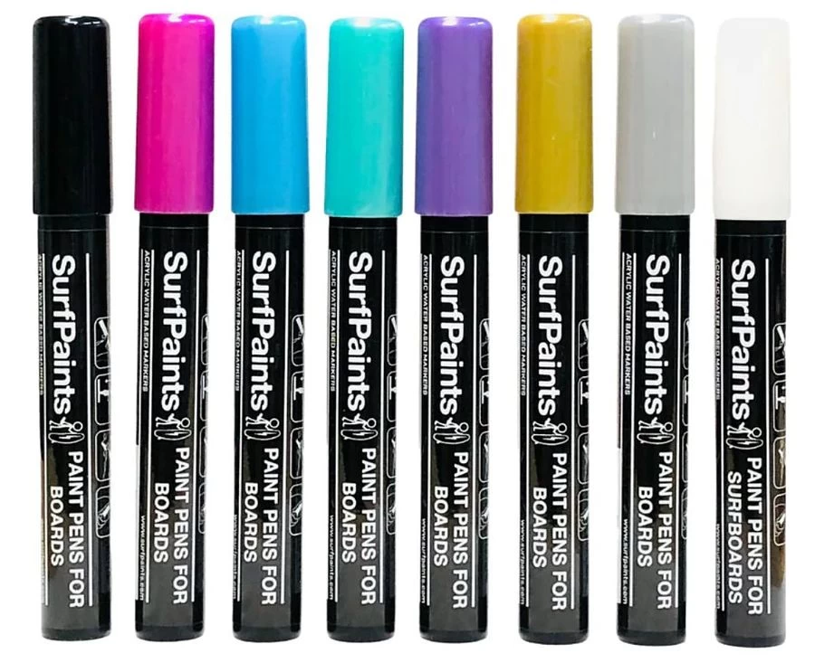 Surfpaints acrylic, water-based, non-toxic and fade resistant paint pens are designed to have the best adhesion to Fiberglass and Foamy slick surfboards. The paint pens are bullet shaped and 4mm in diameter. Surfpaints are travel safe and works on over 12 different surfaces including fins and skateboards.